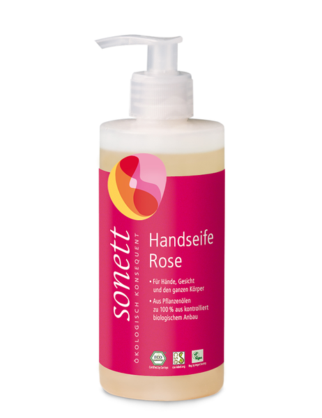 Eine wunderbar nach Rose duftende, mild pflegende, flüssige Seife für Hände, Gesicht und den ganzen Körper. Die Öle und die ätherischen Öle für diese Handseifen sind zu 100% aus kontrolliert biologischem Anbau oder Wildsammlung. Das Kokosfett kommt aus einem Fair Trade Projekt in der Dominikanischen Republik.