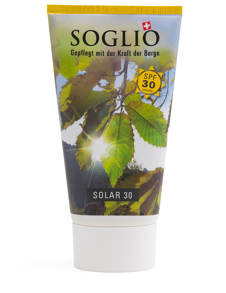 Die Solar 30 bietet dank Extrakten aus Bergeller Kastanienblättern und Nussschalen in Kombination mit einem modernen, effizienten UV-Filterkomplex einen zuverlässigen und ausgewogenen Schutz vor schädlicher UVA- und UVB-Strahlung. Die Creme wurde speziell für empfindliche Haut entwickelt, ist frei von Duftstoffen, spendet intensiv Feuchtigkeit und weisselt nicht. Die Creme zieht schnell ein und sorgt damit für einen sofortigen Schutz ohne zu weisseln. Vorsicht beim Auftragen: diese natürlichen Extrakte können Flecken auf der Kleidung verursachen.
