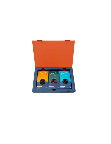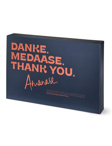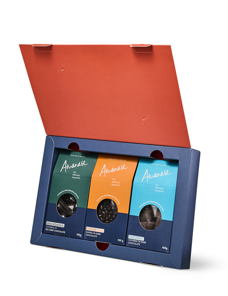 Diese Amanase Geschenkbox vereint drei Sorten feinste Bio-Schokolade aus Ghana. Entdecke echten Genuss mit Wirkung: Unsere Geschenkbox enthält drei handgefertigte Bio-Schokoladenkreationen – hergestellt direkt in Ghana, dort wo der Kakao wächst. • Kakaonibs – 70% Zartbitterschokolade mit knackigen, aromatischen Kakaonibs • Macadamia Salted Caramel – edle Macadamianüsse mit gesalzenem Karamell in 80% Zartbitterschokolade • Coconut Bites – Exotische Kokosfüllung, doppelt umhüllt mit kräftiger 80% Schokolade Alle Sorten sind vegan, biologisch und fair produziert – für bewussten Genuss und eine nachhaltige Zukunft.