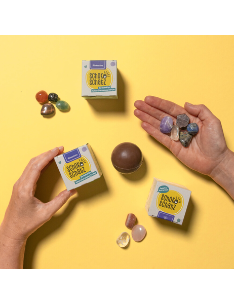 Feinste Fairtrade Bio-Vollmilchschokolade trifft auf ein hochwertiges Geschenk: Das faire „SchokoSchatz Kids“ überrascht nach dem Vernaschen der leckeren Schokoladenkugel mit einem echten Edelstein. Insgesamt gibt es 10 verschiedene Edelsteine, die gesammelt und getauscht werden können. Mit einer kindgerechten Infobroschüre zur Wirkung der Steine wird daraus die nachhaltigste (Kinder-)Überraschung für Klein und Gross! Plastikfrei, Bio und Fair! Entdecken – geniessen – sich freuen! Achtung: Wegen verschluckbarer Kleinteile nicht für Kinder unter 3 Jahren geeignet.