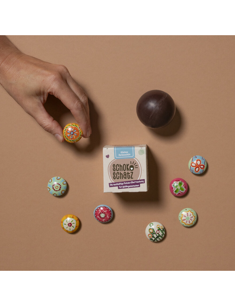 Feinste Fairtrade Bio-Zartbitterschokolade trifft auf kunstvolle Handschmeichler: Das faire SchokoSchatz «Dankeschön» überrascht nach dem Vernaschen der köstlichen Schokoladenkugel mit liebevoll gefertigten Blumenmotiven aus fair gehandeltem Speckstein aus Kenia. Jede Blume ist ein Unikat – von Hand geschnitzt, geschliffen und anschliessend sorgfältig bemalt. Die Farben kommen aus Deutschland, sind lösungsmittelfrei, auf Wasserbasis und absolut lichtecht. Zum Abschluss wird jedes kleine Kunstwerk mit Wachs poliert und erhält so seinen sanften Glanz. Plastikfrei, Bio und Fair! Entdecken – geniessen – sich freuen! Achtung: Wegen verschluckbarer Kleinteile nicht für Kinder unter 3 Jahren geeignet.