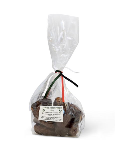 Orientalischer Superfood-Genuss der Extraklasse: Unsere naturbelassene Jumbo-Medjool-Dattel aus Palästina ist die Königin unter den Datteln: gross, weich und verführerisch aromatisch mit natürlicher Vanille- und Caramel-Note. Dank der aufwendigen Erntemethode, bei der die Früchte bis zur vollen Reife an der Palme bleiben, entfalten sie ihr volles Aroma – ganz ohne künstliche Behandlung. Mit jedem Bissen unterstützt du faire Arbeitsplätze, nachhaltige Anbaumethoden und ein Projekt, das Mensch und Umwelt gleichermassen guttut.