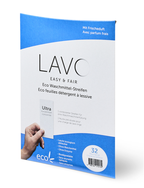 LAVO (Dizolve avant) avec un parfum frais. LAVO concentre une puissance de lavage écologique ultra-concentrée dans une minuscule bande d'alimentation pré-dosée. Il suffit de le placer dans le tambour à linge. C'est fait ! Les bandes détergentes LAVO sont facilement biodégradables, sans phosphates, sans colorants, sans azurants optiques, sans solvants organiques, sans parabènes, sans animaux, sans huile de palme, développées sans tests sur les animaux. Utilisé avec précaution, LAVO peut être utilisé pour laver la laine à la main. Il n'est pas recommandé d'utiliser LAVO pour la soie. Attention : Les recommandations de lavage des vêtements doivent toujours être suivies.