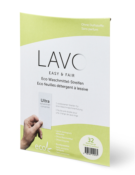 LAVO (Dizolve avant) sans parfum. LAVO concentre une puissance de lavage écologique ultra-concentrée dans une minuscule bande d'alimentation pré-dosée. Il suffit de le placer dans le tambour à linge. C'est fait ! Les bandes détergentes LAVO sont facilement biodégradables, sans phosphates, sans colorants, sans azurants optiques, sans solvants organiques, sans parabènes, sans animaux, sans huile de palme, développées sans tests sur les animaux. Utilisé avec précaution, LAVO peut être utilisé pour laver la laine à la main. Il n'est pas recommandé d'utiliser LAVO pour la soie. Attention : Les recommandations de lavage des vêtements doivent toujours être suivies !