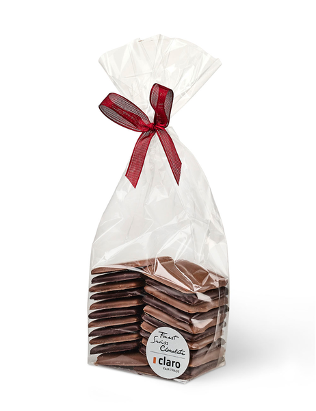 Délicieux carrés au nougat enrobés de chocolat crémant et au lait. Fabriqué soigneusement selon une méthode traditionnelle avec des ingrédients du Commerce Equitable et de culture biologique contrôlée dans une petite entreprise au Emmental.
